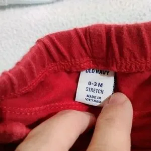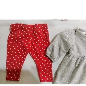 Charming 6 piece baby outfit bundle. Features a light blue bodysuit, red leggings, gray dress, and yellow and pink hats with pink accents. Ideal for versatile styling.Like new condition