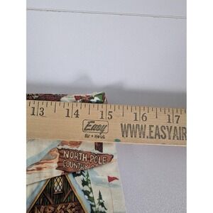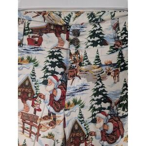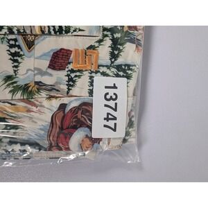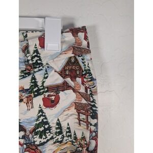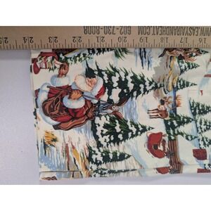 Color: Multicolor print featuring Santa, reindeer, evergreen trees, cabins, and snowy landscapes on a light background.
