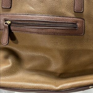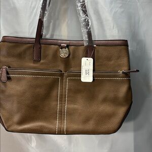 Elegant brown leather tote. Features dual handles and 2 front zipper pocket and 1 backside zipper pocket 2 inside zippers and 3 inside pockets and one main zipper, Gold-tone clasp adds a touch of luxury.