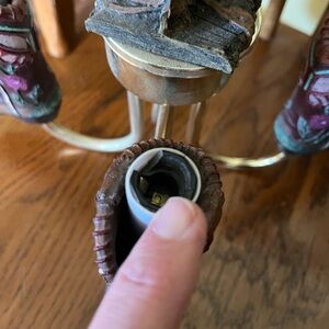 The boots and saddle are resin I believe. One of the light sockets is cracked but you can still put a bulb in it. I never hooked it up to electrical or anything so it has not been tested. It is a beautiful piece the gold chain and top plate have some slight discoloration nothing major just needs a good polish. The boots move so you can line them up when hung. Again awesome one of a kind piece.