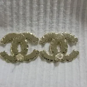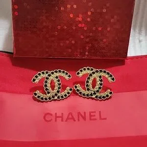 Sophisticated CHANEL earrings with iconic interlocking design. Features gold and black tones. Elevate your style effortlessly.