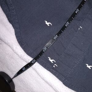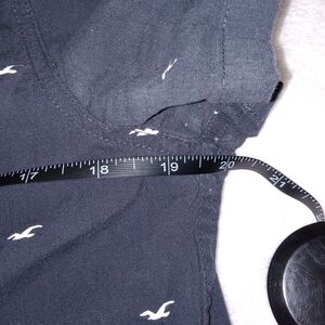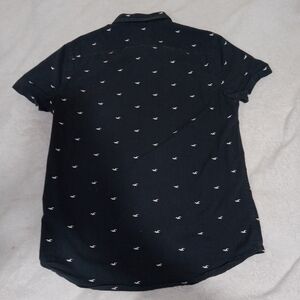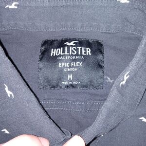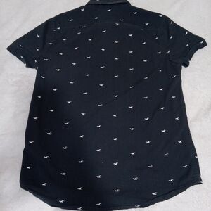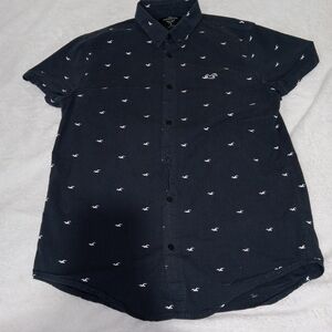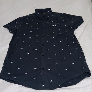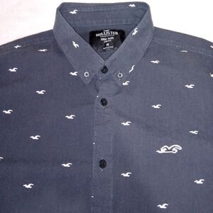 The Hollister men's navy blue button-down shirt is made from a comfortable cotton-spandex blend, providing a stretchy and flexible fit. The short sleeve shirt features a collared neckline, button closure, and the iconic Hollister logo pattern. Perfect for casual occasions like travel, parties, or daily wear, this shirt is a classic choice with a hint of preppy style and a Y2K-inspired theme. Made by Hollister, a trusted brand known for its trendy and quality clothing, this shirt is machine washable for easy care and maintenance.