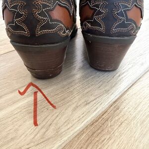 See pics Right heel & left heel has been glued as leather was coming off. Rest of boot in excellent condition Sold as is & at a great price.