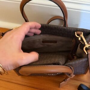 Stylish Michael Kors bag and matching wallet set. Rich brown with tan accents. Perfect for daily use.