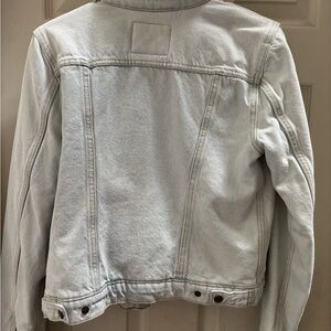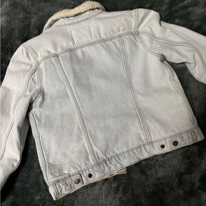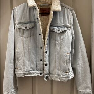 Levi's denim jacket with cozy sherpa lining. Light blue with button closure. Ideal for layering.