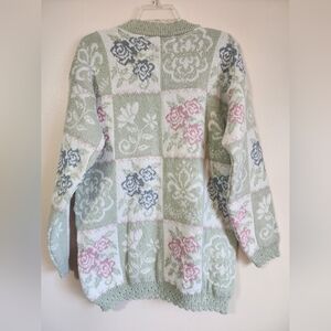 Stay cozy and stylish with this floral patterned sweater. Featuring a blend of green, pink, and blue hues, it's perfect for any casual outing. (Size label is missing)