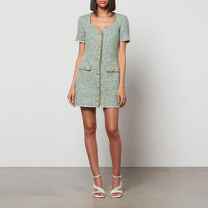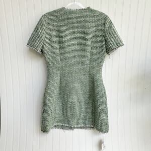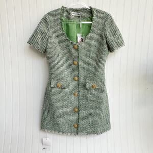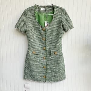 Tags: Self-Portrait dress, bouclé mini dress, green tweed dress, designer occasionwear, structured mini dress, button front dress, short sleeve tweed, NWT designer dress, luxury daytime dress, green bouclé gown, chic tailored dress, modern feminine style