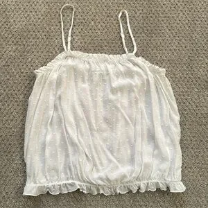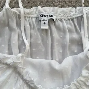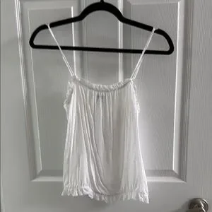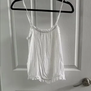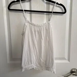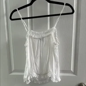 This white camisole from Express showcases a relaxed fit with charming ruffled details along the neckline and hem. Its sleeveless design and airy fabric make it an ideal choice for warm weather, offering both comfort and style. The crisp white color enhances its versatility, making it a staple piece for any wardrobe.