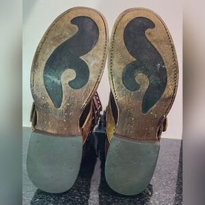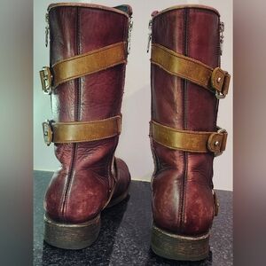 Burgundy leather boots with tan straps. Studded details and side zipper. Rugged and stylish.