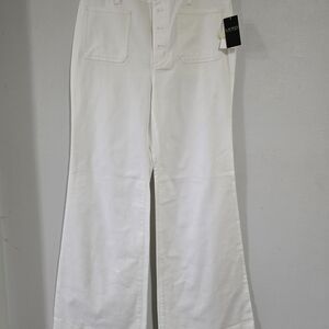 Beautiful cream trousers with a classic flare leg design. Features a 4 button closure detail and subtle stitching. Tall girl friendly! Waist 17, rise 12.5, inseam 33.