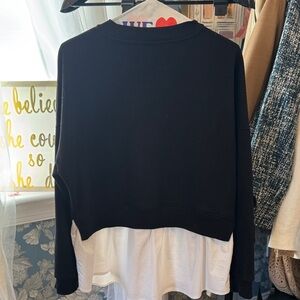 Chic black sweatshirt with white shirt attached. Boyfriend fit. Comfortable and stylish. Ideal for casual wear.