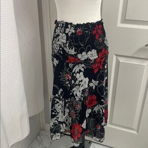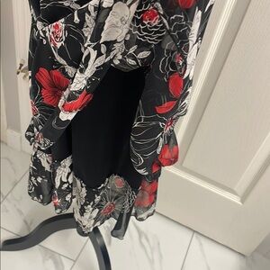 Very pretty, no tags, polyester lightweight sheer fabric. Two layers, one is black overlaid with the floral fabric. Can be worn as a mini dress or a skirt. Great condition no flaws.