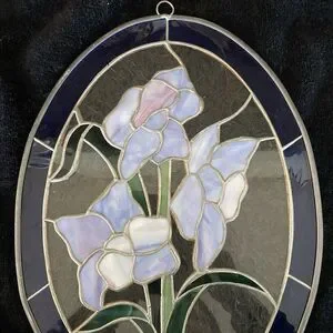 This vintage handcrafted large stained glass suncatcher features beautiful iris flowers, adding a decorative touch to any room. Made in the United States.. this multicolored piece is crafted with a glossy finish and ready to hang. This original piece, measuring 13" in height and 9.5" in width, is a beautiful representation of late 20th-century artistry and craftsmanship.