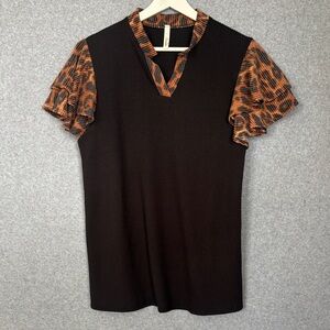 NEW Ruffle Sleeve Two Tone Top with Accents L Black Leopard