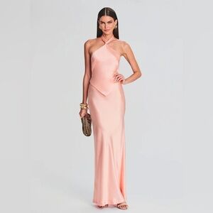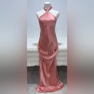 Step into a realm of elegant style with our ethereal Ester Dress. This halterneck top features two tie elements at its back and a mermaid silhouette skirt. Shown here in Cantaloupe.
