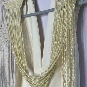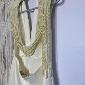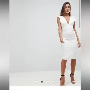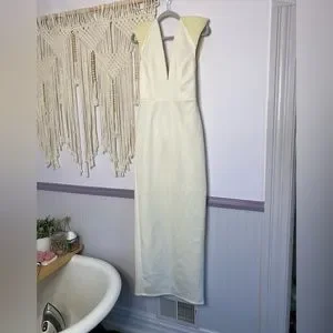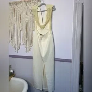 Chic cream midi dress. Open back with draped detail. Ideal for elegant events.