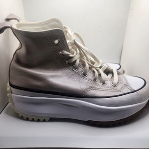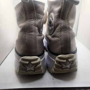Stylish and versatile high-top sneakers for women. Perfect for casual outings. The Converse Run Star HighTop Chuck Taylor All Star Beige Leather Sneakers in size 8 are a stylish and comfortable option for casual wear. Featuring a lace-up closure, leather upper, and rubber outsole, these sneakers offer a solid beige color with logo accents. With a high-top shoe shaft style and standard shoe width, these sneakers are perfect for summer, fall, and spring seasons. The foam insole provides added comfort, making them suitable for walking activities. Designed with a supination pronation and a rubber cleat type, these Converse sneakers are a versatile choice for everyday wear. Some wear on white rubbers otherwise EUC. Size Mens 6.5 women's size 8