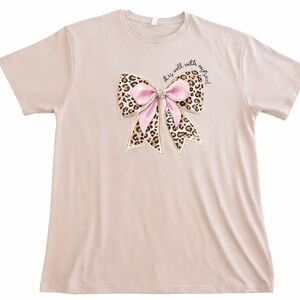 Soft cotton/poly blend tee featuring a large leopard-print bow graphic with pink ribbon detail and the phrase “It is well with my soul.” Neutral blush-beige tone makes it easy to style year-round. Classic crew neck with a relaxed, comfortable fit—perfect with jeans, leggings, or layered under a jacket. Gently worn with plenty of life left.