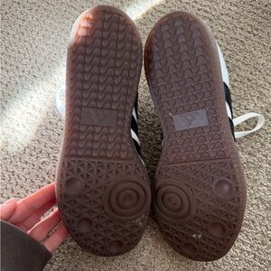 Adidas Samba sneakers in white with black stripes. Iconic design with a sleek look. Small amount of wear on right toe (pictured slide 2). Small stain that could be easily removed on left shoe (pictured slide 7). Worn once!