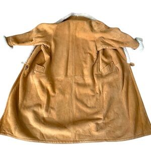 Absolutely stunning vintage Overland Sheepskin Co. long coat crafted from genuine sheepskin shearling. Features a rich caramel/tan suede exterior with plush cream shearling lining throughout for exceptional warmth and comfort.