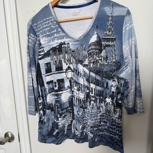 Paris graphic top, Eiffel Tower shirt, Sacré-Cœur print, travel graphic tee, French cityscape blouse, artistic street scene top, 3/4 sleeve V-neck, soft stretch knit top, vintage Paris aesthetic, wanderlust fashion, Euro streetwear, artsy graphic shirt, blue Paris print top, comfortable everyday top, travel lover gift, casual chic blouse