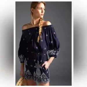 FARM RIO FOR ANTHROPOLOGIE off the shoulder romper with Pineapple embroidery