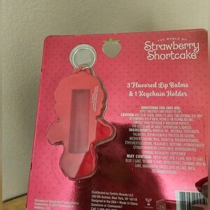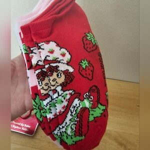 Cute Strawberry Shortcake socks with matching lip balm set. Features pink and red colors. 5 sock pairs come in this set. Slight smudge of something rubbing against the red sock shown in pics above. Should come off with a wash 🥰