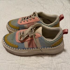 Vibrant sneakers with a patchwork design. Features pink, blue, and yellow accents. Perfect for a bold look.