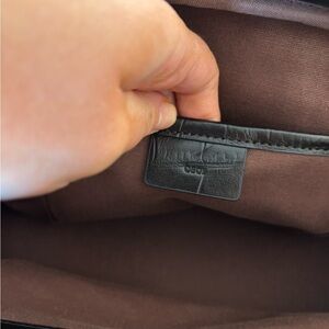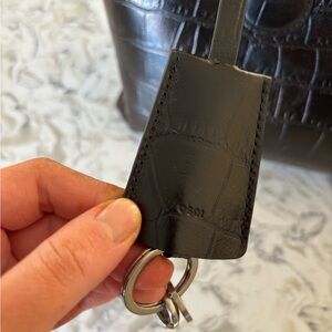 This sophisticated black handbag features a stylish crocodile-embossed design, perfect for any occasion. Its sleek and elegant look makes it a versatile accessory for your wardrobe.