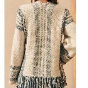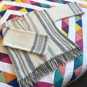 Made with a Peruvian alpaca and merino wool blend by Faherty's artisan partners in Peru, it's a pullover poncho rich with tradition and time-honored craftsmanship. The oversized fit and playful fringe trim make it a charming and unexpected transitional layer. The piece is in excellent condition with no signs of wear. Selling for a friend who received it as a gift. Retails for $268 and sold out online.