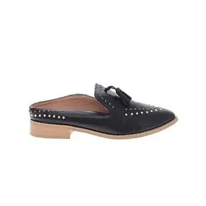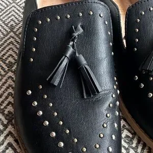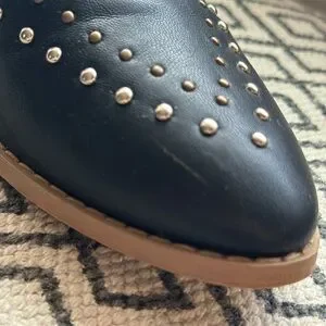 Super cute slip-on studded leather mule loafers! Genuine leather with silver and bronze studs, please review all photos to see condition, there are some light scratches in the black leather.