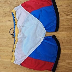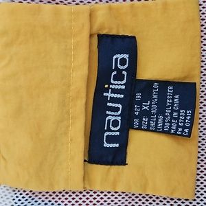 Nautica Wakeboarding swim trunks shorts. Elasticated waistband with drawstring. Inner small pocket, outer side pockets with closure. Mesh inner, a bit stretched out at leg openings. Red, blue and black color blocked panels. Waistband about 23". Rise 12.75", inseam 6.5".