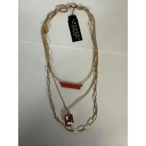 Features a gold-tone multi-layer chain design with an eye-catching orange bar and a pink gemstone pendant.