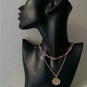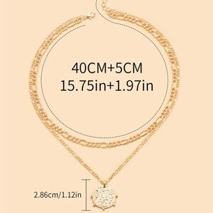 Description: These two gold chains can be described as layered elegant and minimalist. The top chain features a bold flat link design with a Figaro-style pattern while the bottom chain is finer and holds a textured round medallion pendant with a vintage-inspired look. Together they create a stylish stacked effect that feels both timeless and modern.