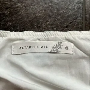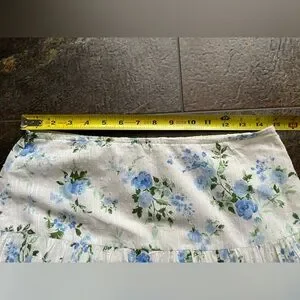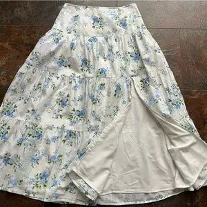 Women’s Altar’d State white with blue floral pattern flowy cottagecore peasant style skirt. Side zipper and hook and eye closure fully lined with a slit. Romantic girlie delicate and charming. Pre owned. No notable flaws. See photos for measurements and condition. Whimsical, breezy, twee, coquette, coastal