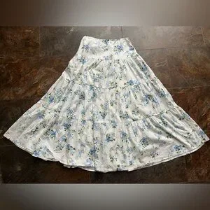 Women’s white and blue floral peasant boho tiered ruffle pull on skirt. Medium
