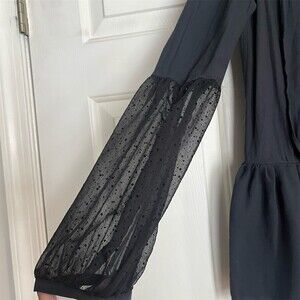 Keywords: Free People blouse, black peplum top, swiss dot blouse, sheer sleeve top, chiffon blouse, boho top, ruffle trim, gathered yoke, tiered hem, long sleeve blouse, split v neck, flowy relaxed fit, women’s XS top, date night top, festival outfit