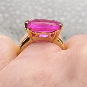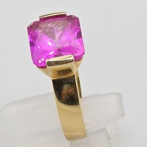 This ring is so classic and bright! Featuring a generous cushion cut extremely vivid pink sapphire set in solid 925 sterling silver with a 14k vermeil gold overlay. This ring is a showstopper! In like New condition!