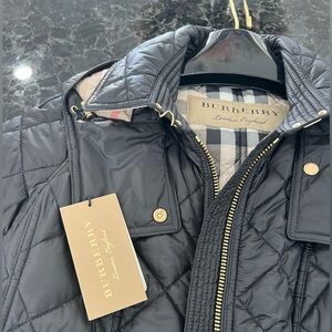 Burberry Elegant coat with black quilted design.size medium Features a belted waist front zipper and gold-tone hardware. With a detachable hood. Brand new with tags Perfect for warmth and style.