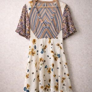 Fun and feminine Free People Mix It Up mini dress featuring a unique patchwork of mixed floral and striped prints. This easy, flowy silhouette has a relaxed boho feel—perfect for everyday wear, festivals, or casual outings.
