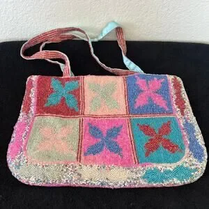Vintage K.C Malhan Multicolor Hand-Beaded Shoulder Bag with Flower Motif Retro