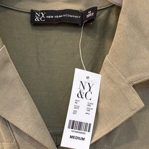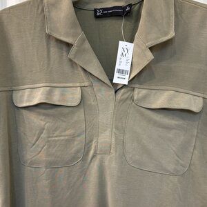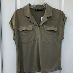 Chic olive button down with short sleeves. Features classic collar and dual front pockets.