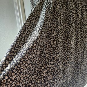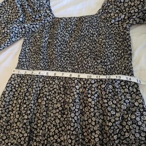 Black base with tiny white floral ditsy pattern. Features a square neckline, smocked bodice for a comfy, flattering fit, and puffed elbow-length sleeves with ruffled cuffs. Easy throw-on style that works for casual days, brunch, or layering with boots + a jacket.
