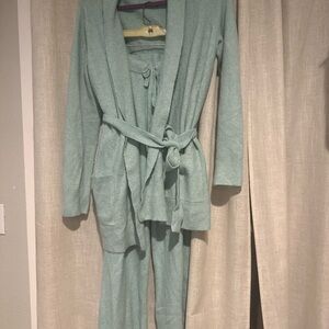 Cozy lounge set with a wrap cardigan and drawstring pants. Soft fabric. Perfect for relaxation.