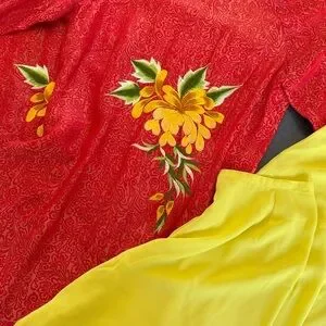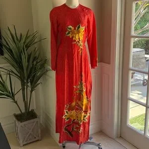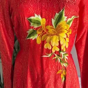 Beautiful modern ao dai set with dress and pants. This dress is Asian size L which is equivalent to a US size S/M.