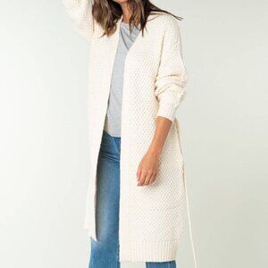 This longline sweater features an open-front silhouette with a removable tie belt for an easy, flattering fit. The textured knit adds warmth without feeling heavy—perfect for everyday wear through fall and beyond.