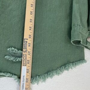Women's olive green utility-style button front shirt with an oversized, relaxed fit. Features snap button closure, long sleeves with snap cuffs, and an intentionally raw/frayed hem for a casual, worn-in look. Can be styled as a shirt or lightweight shacket.