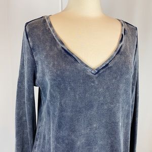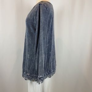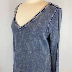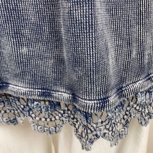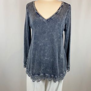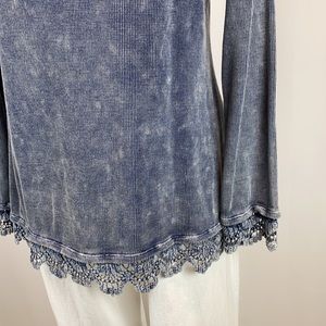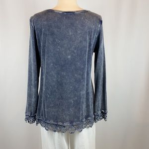 Chic washed indigo tunic. Features lace trim. Soft and comfortable. V-neck style.