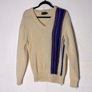 Vintage Wolsey Cream Purple Blue Wool Knit Pullover V Neck Sweater S