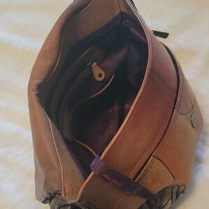 Vibrant floral artwork on premium leather. Unique and stylish shoulder bag. Perfect for any occasion. multiple zipper compartments. Hardly used. Has protective bag extra long staples to use as crossbody